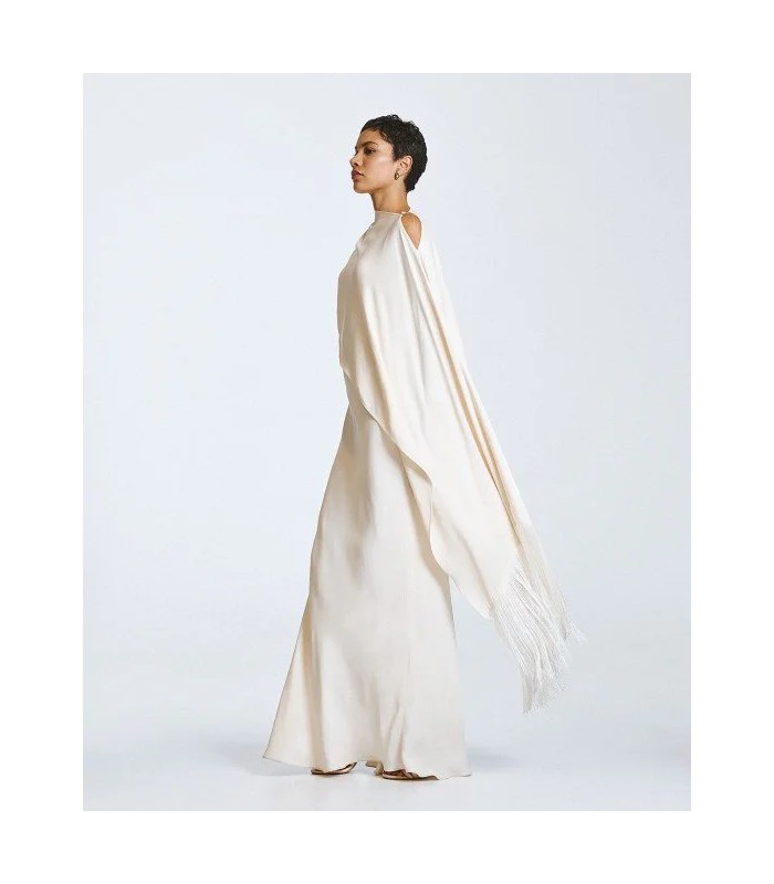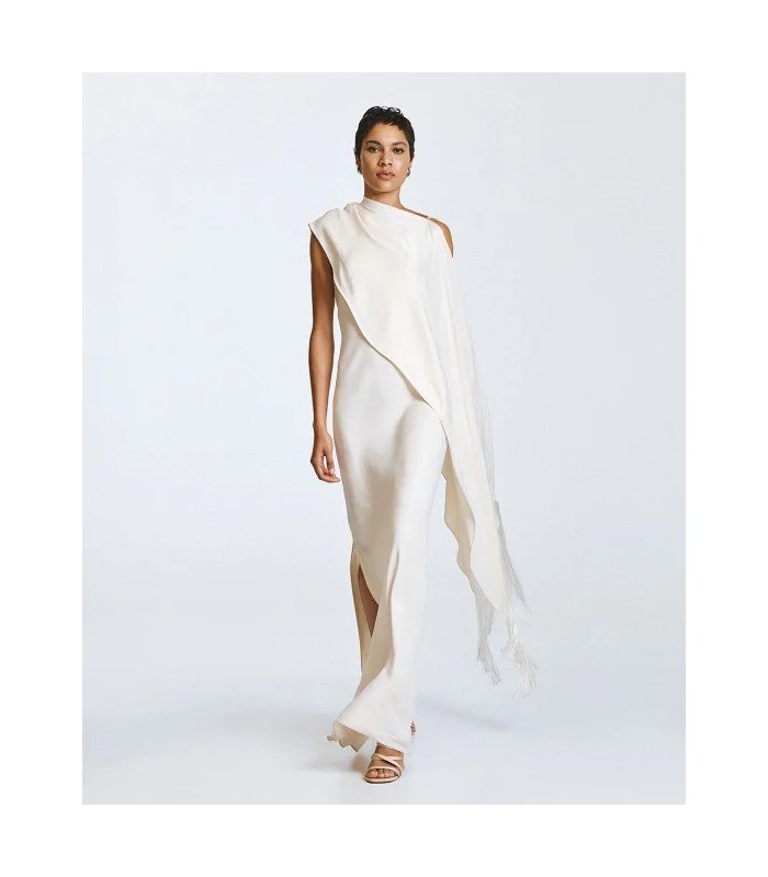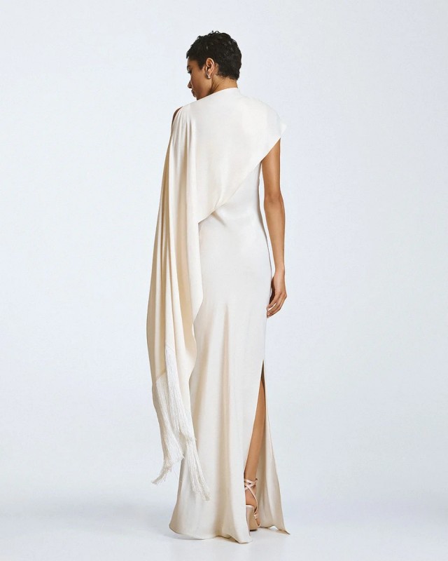 Vestido largo con acabado satinado y diseño de un solo hombro. Presenta una abertura lateral y una capa asimétrica desmontable con flecos.