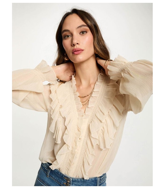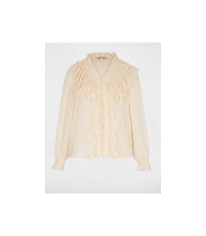 Esta camisa entallada realza las formas con elegancia mientras ofrece un estilo fluido y ligero. Los volantes delicados aportan una feminidad sofisticada, mientras que los botones añaden un detalle refinado y decididamente moderno. Una prenda que combina modernidad y encanto atemporal.