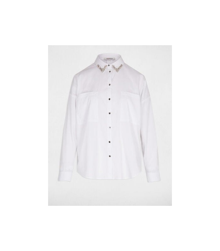 Esta camisa oversize reinventa los volúmenes con un estilo moderno y desenfadado. Su cuello cruzado realza el escote, aportando un toque de elegancia femenina. Los detalles de strass iluminan sutilmente la prenda para un acabado sofisticado y a la moda.