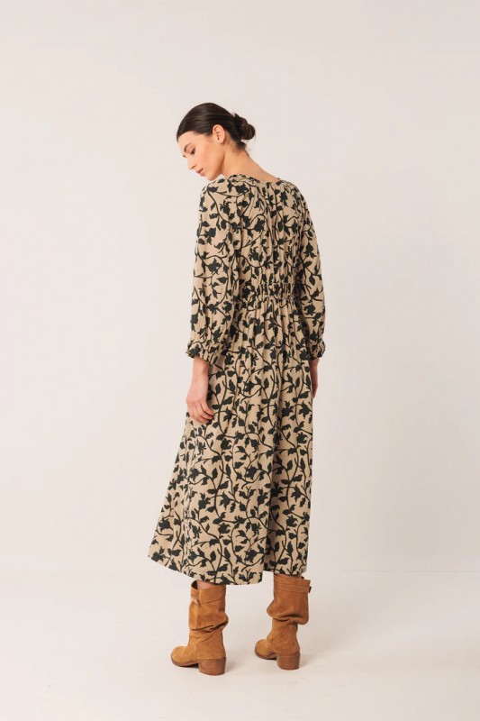 Un vestido midi no puede faltar en el armario. Tiene escote en V y manga globo con puño. Cintura engomada para estilizar la silueta pero no se ajusta al cuerpo. Tiene bolsillos ocultos en los laterales y es de largo midi.