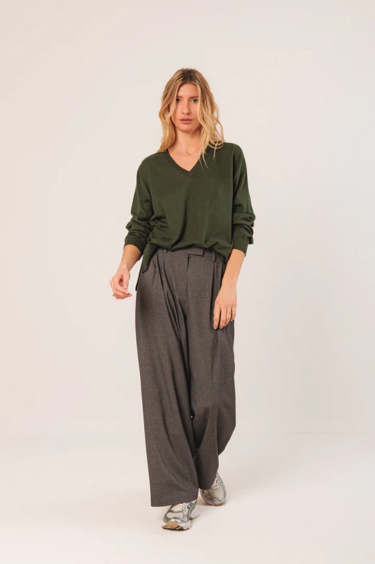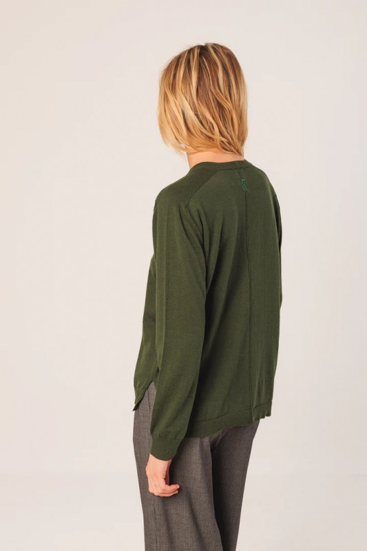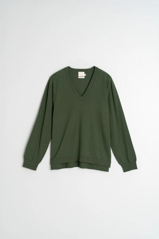Jersey básico fino de algodón orgánico, con escote pico y manga larga. Detalle de anagrama bordado a tono.