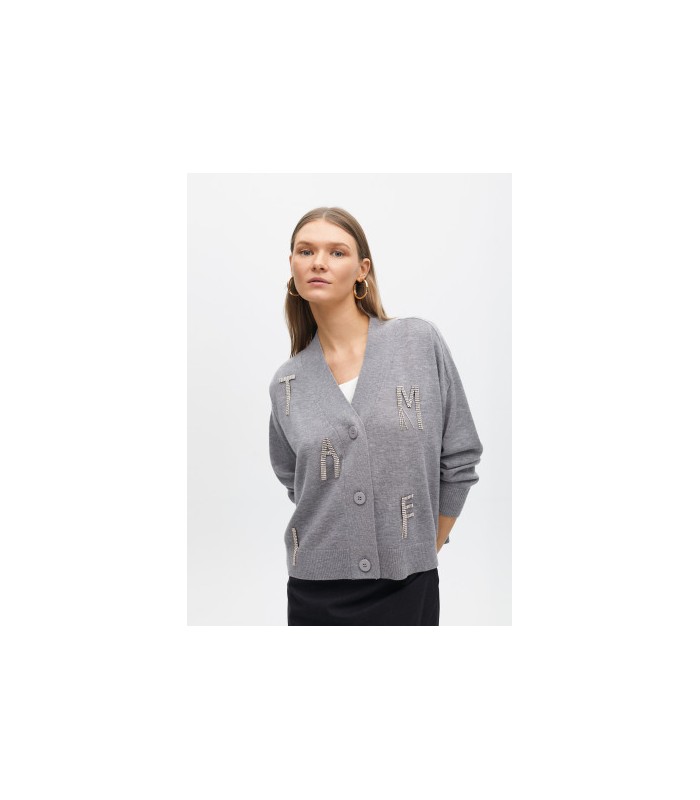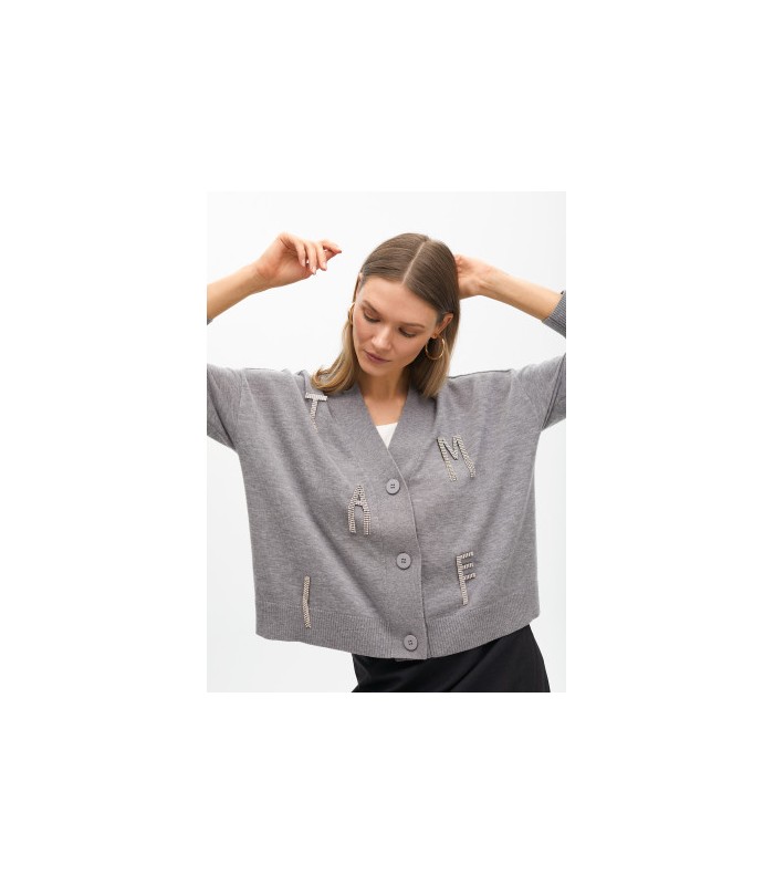 Cardigan gris de punto con aplicación de joyas brillantes que forman letras.