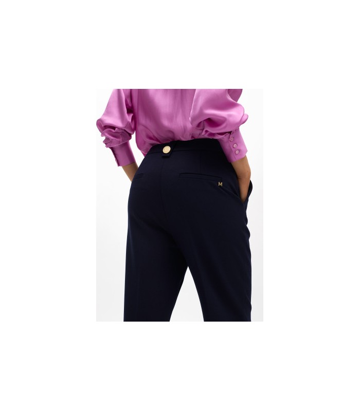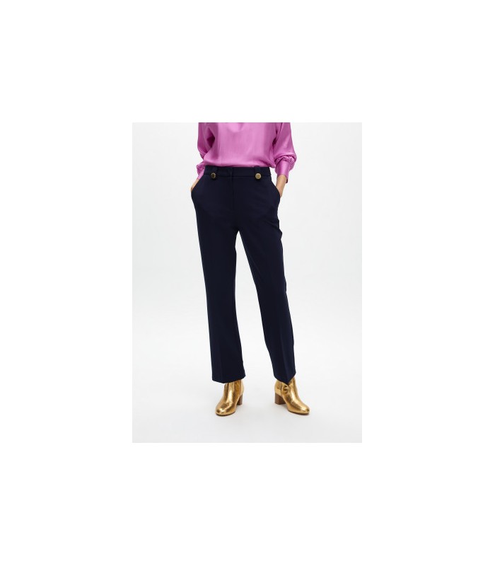 Pantalón de punto elegante con botones dorados decorativos en la cinturilla.