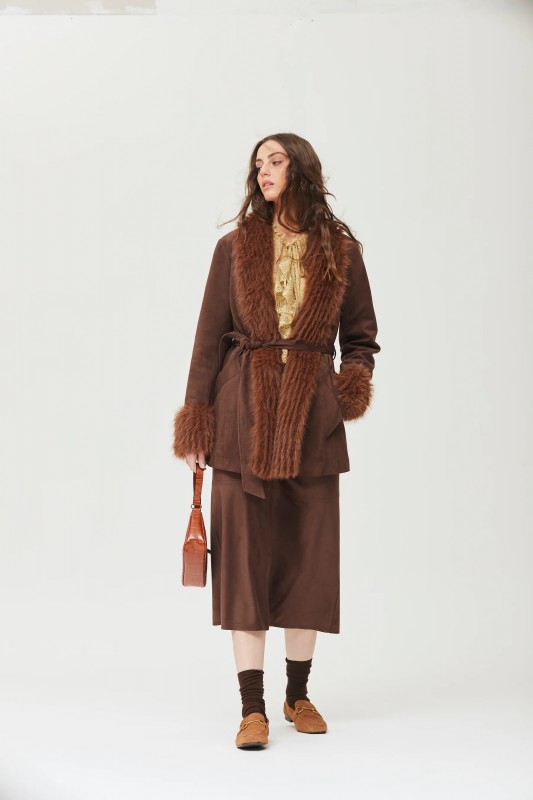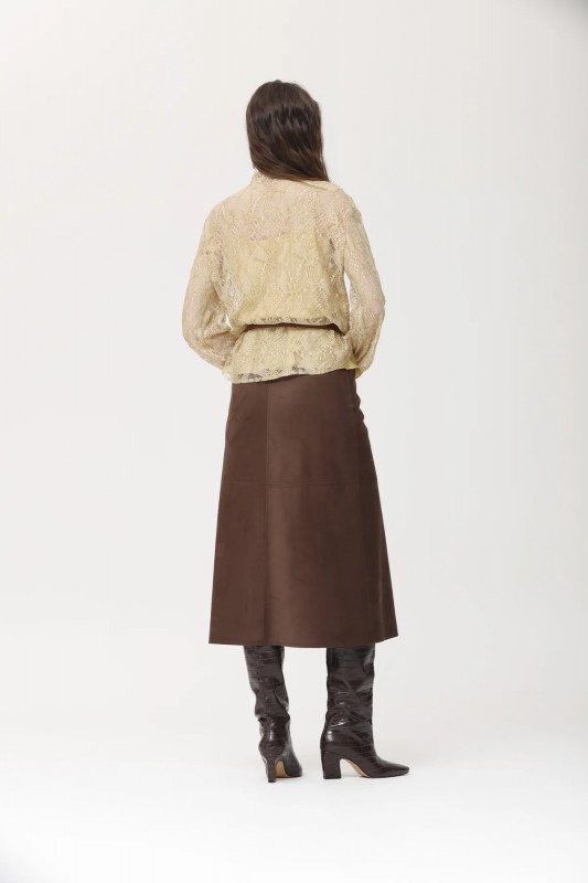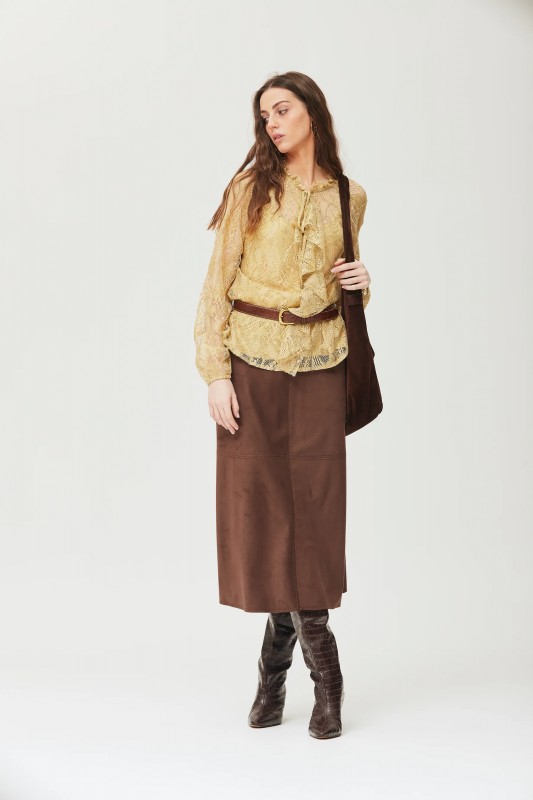 FALDA MIDI EFECTO ANTE CON CINTURA ELÁSTICA. ALTURA MODELO 1,75CM