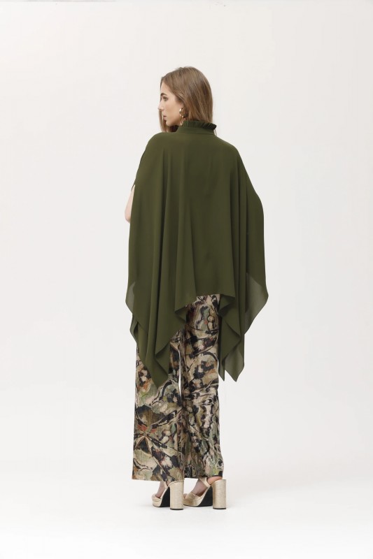 CAPA LIGERA ASIMETRICA, CON CUELLO VOLANTE EN EL CUELLO Y LAZADA
