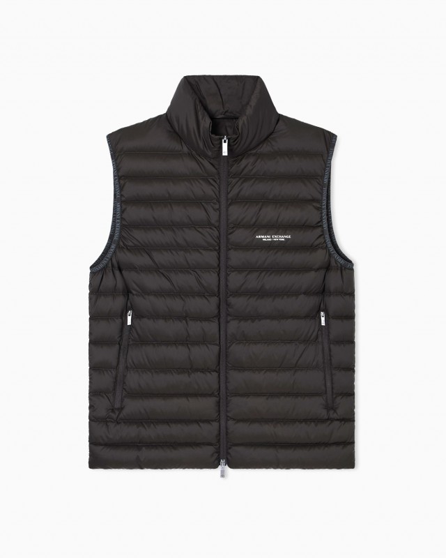Un chaleco de plumas confeccionado con un exterior de nailon resistente y un cálido acolchado de plumas, la prenda perfecta para afrontar el entretiempo con estilo y ligereza. Este chaleco destaca por su acolchado horizontal, que garantiza una distribución uniforme del calor, y por su diseño versátil. El cuello alto protege del viento, mientras que el cierre frontal con cremallera y los bolsillos laterales con cremallera añaden funcionalidad. El logotipo "Armani Exchange Milano / New York" estampado en contraste en el pecho le da un toque icónico.