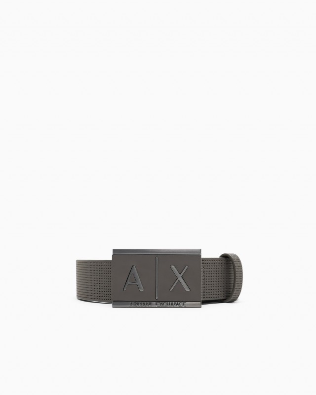 Cinturón confeccionado en piel trabajada y dotado de hebilla rectangular con logo grabado tono sobre tono.
