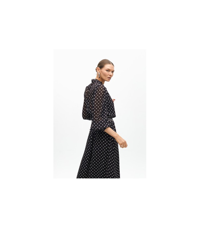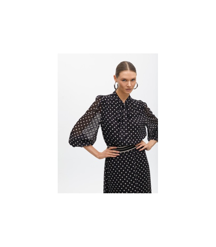 Confeccionado en tejido ligero, destaca por su caída fluida y su lazo en el cuello.