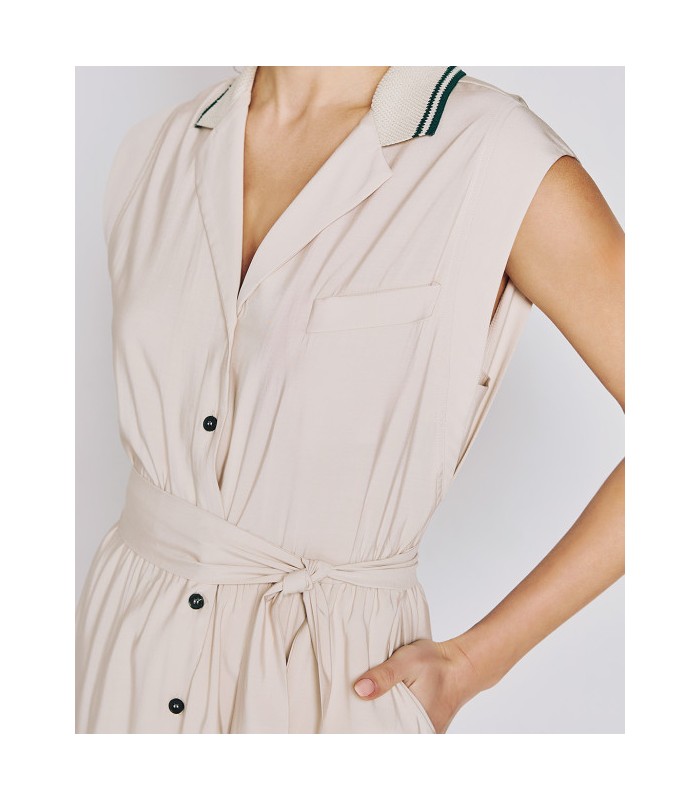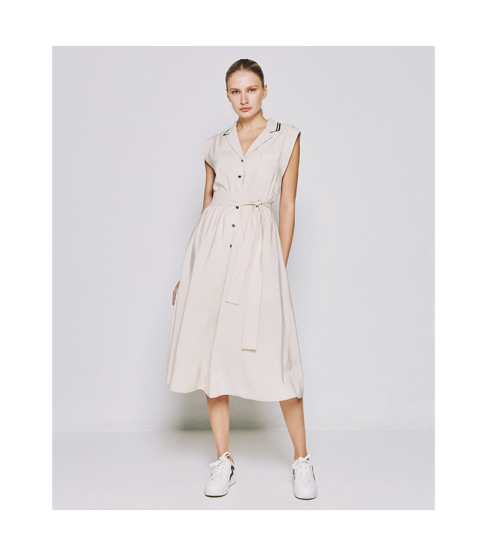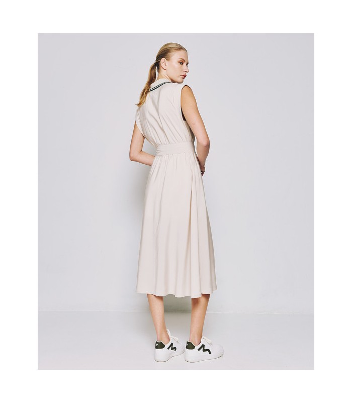 Vestido camisero midi con cuello elástico a rayas. Cuenta con bolsillos laterales, cinturilla elástica y cinturón extraíble. Ideal para looks casuales con estilo.