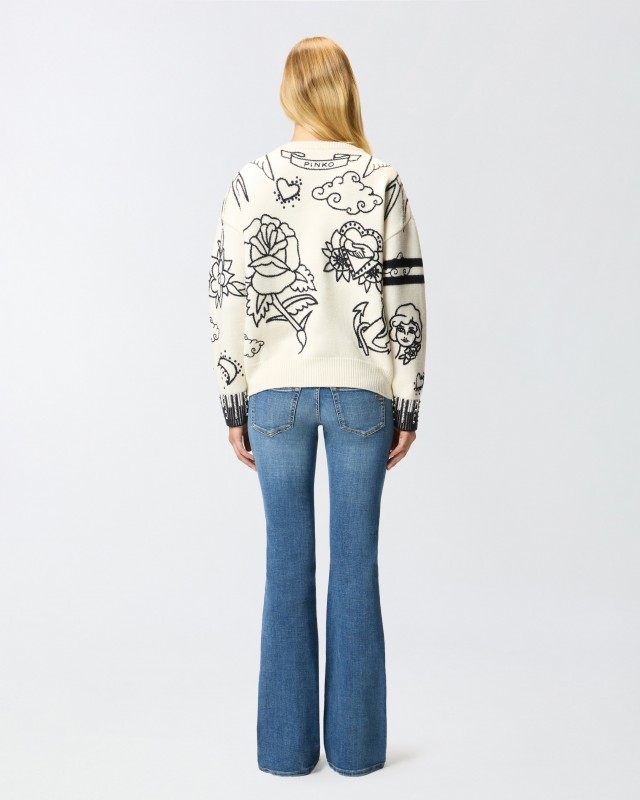 Jersey de cuello redondo y manga larga de lana merina: un hilado suave y ligero para un armario original. Luce un look inédito con este diseño repleto de motivos bordados y detalles de pedrería en los puños. El cuello redondo, el bajo y los puños son de canalé, mientras que el toque final lo aporta el logotipo de letras PINKO en la parte posterior del diseño. La prenda se ha sometido a pruebas de acabado para minimizar la posible formación de bolitas, garantizando una mayor suavidad y durabilidad del tejido.