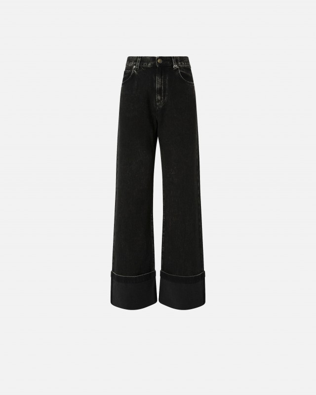 Vaqueros de cinco bolsillos para mujer de corte «wide leg» con pernera recta y amplia con dobladillo fijo. La prenda está confeccionada en denim negro de algodón y lyocell para brindar un tacto más fluido y está tratada con diferentes técnicas de lavado para alcanzar el tono final. Para personalizar el diseño al más puro estilo PINKO encontramos la trabilla extraíble con logotipo Love Birds. Juega con las combinaciones y ponte estos vaqueros con la cintura caída y el tiro bajo para lograr un look más masculino o combínalos con prendas más femeninas para lucir un estilo que apuesta por los contrastes. Trabillas para el cinturón y cierre frontal con botón y cremallera oculta. El modelo queda un poco más holgado respecto a la talla habitual.