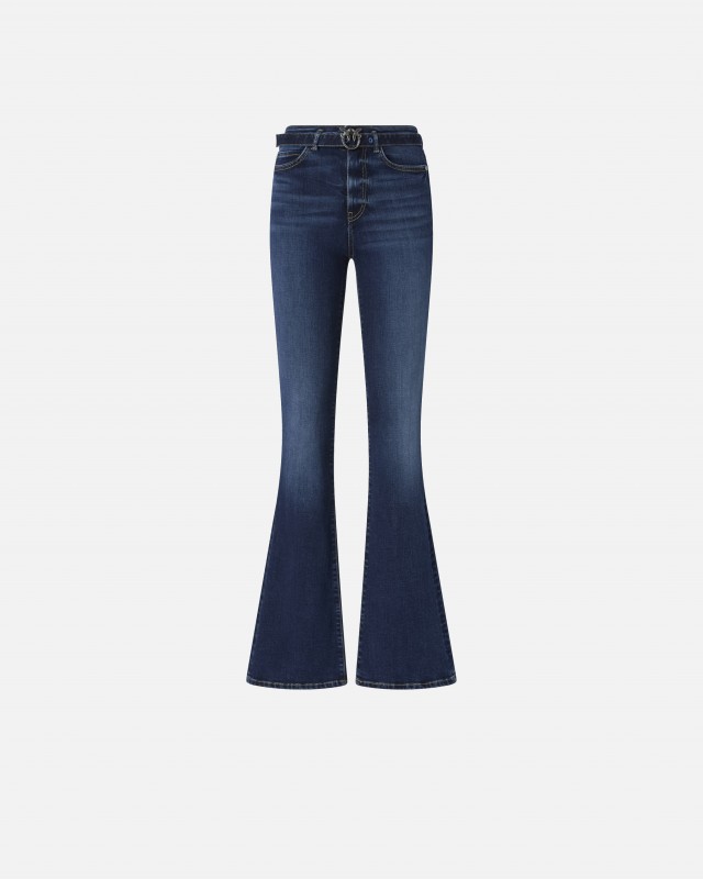 Vaqueros de cinco bolsillos con corte acampanado, con pernera ceñida hasta la rodilla y acampanada en el bajo, confeccionados en denim power elástico de mezcla de algodón y tacto suave. La tela utilizada es un denim de alta recuperación que no se deforma fácilmente y que conserva su ajuste original a lo largo del tiempo. Personalizando el diseño al más puro estilo PINKO encontramos el logotipo de letras de la marca bordado en la parte posterior de la cintura y el logotipo Love Birds con pajaritos bordados en el bolsillo trasero derecho. Se completa con cinturón a juego en el mismo tejido con hebilla metálica Love Birds Diamond Cut. Talle medio con trabillas para el cinturón y cierre con cremallera y botón.