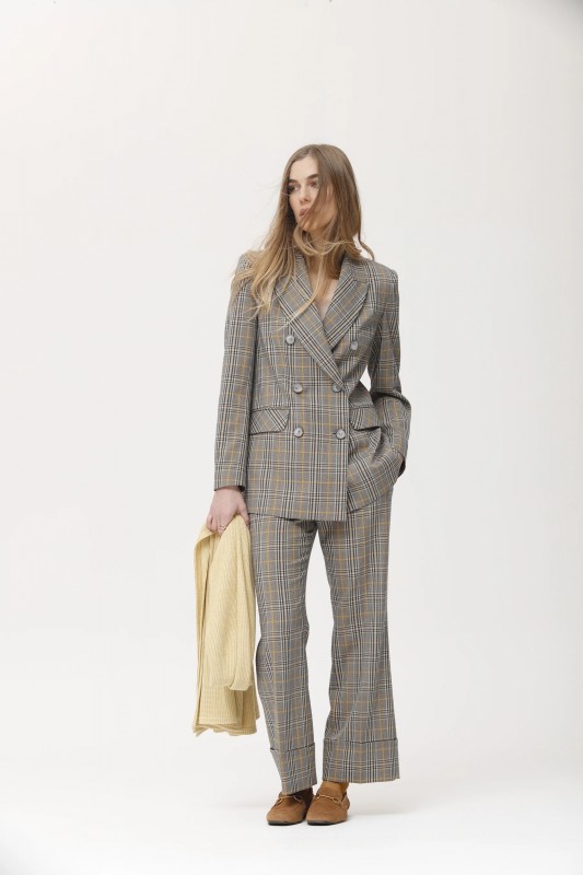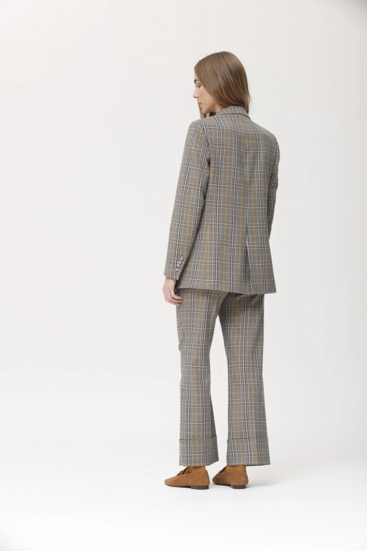 Chaqueta sastre larga de doble botonadura, confeccionada en tejido príncipe de Gales con tonos gris, mostaza y beige. Presenta diseño clásico con solapas, bolsillos con tapeta y hombros estructurados, aportando una silueta elegante y sofisticada. El acabado de inspiración británica y el patrón de cuadros la hacen perfecta para combinar en conjunto con su pantalón a juego o con prendas neutras. Ideal para looks de oficina, ocasiones especiales o estilismos urbanos con personalidad.