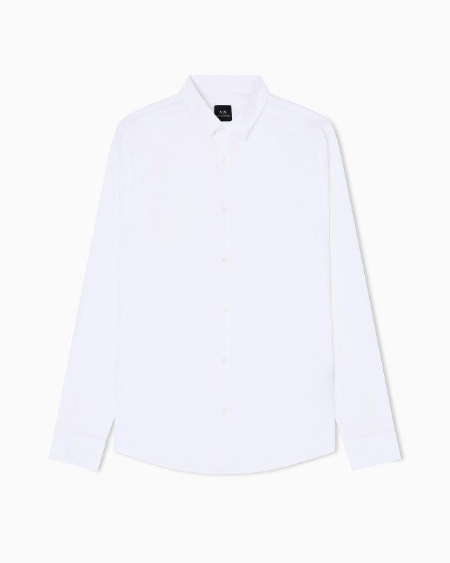 Camisa slim fit confeccionada en popelín elástico. Esta camisa se define por su diseño esencial que presenta cuello clásico, pequeño logo bordado en el pecho, botones en la parte delantera y puños abotonados.