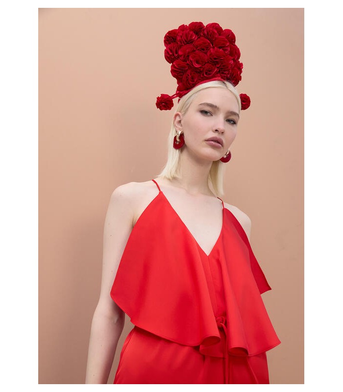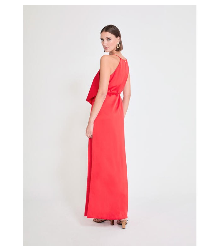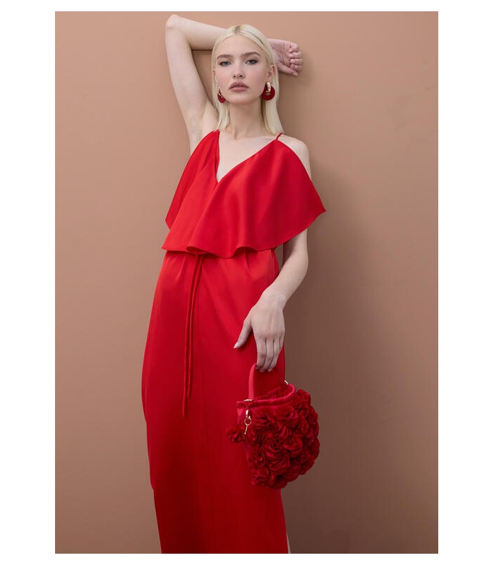 Lujoso vestido largo en vibrante color rojo, con un elegante escote en pico y volantes fluidos. Confeccionado en tejido ligero que se adapta al cuerpo. Perfecto para ocasiones especiales en temporada de primavera o verano.