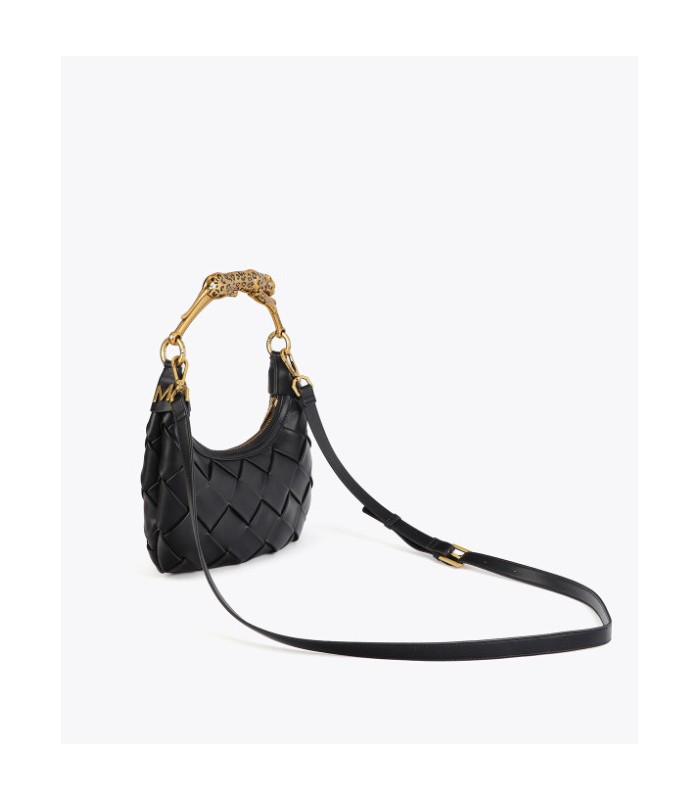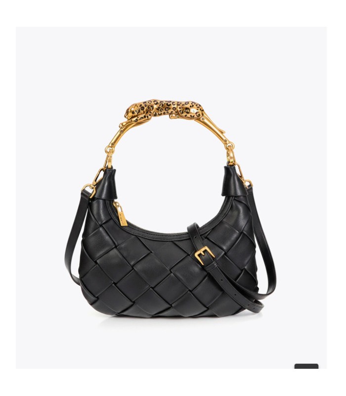 Bolso trenzado en piel sintética, diseño media luna con asa metálica en forma de leopardo. Elegante y versátil, ideal para completar cualquier look. Incluye correa ajustable para un estilo cruzado o de mano. Cierre superior seguro con cremallera.