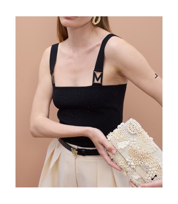 Bolso baguette adornado con pedrería al tono, creando un diseño único y texturizado. Cierre magnético y cadena desmontable para llevar al hombro. Ideal para dar un toque chic a tus outfits de noche.