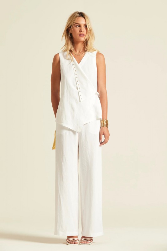 Top de tirantes anchos confeccionado en una mezcla ligera de viscosa y lino. Presenta un diseño asimétrico con cierre cruzado en el delantero, decorado con una fila de botones metálicos laterales y un cierre de lazada que permite ajustar la prenda a la cintura.