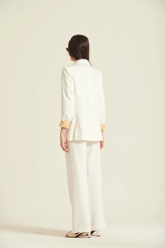 Pantalón de corte sastre confeccionado en Tencel. Presenta un diseño de tiro medio con pinzas delanteras, bolsillos laterales tipo sastre y una pernera ancha que aporta movimiento y elegancia.