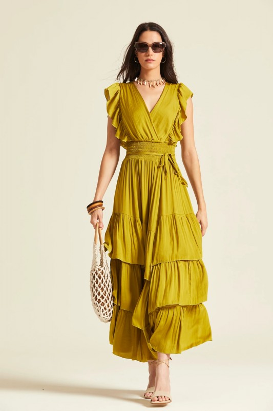 Vestido de tejido ligero y fluido en color mostaza. Presenta escote en V cruzado, cintura elástica tipo nido de abeja con lazo y falda larga con varios niveles de volantes.Un diseño cómodo y femenino ideal para el día a día o eventos relajados de verano