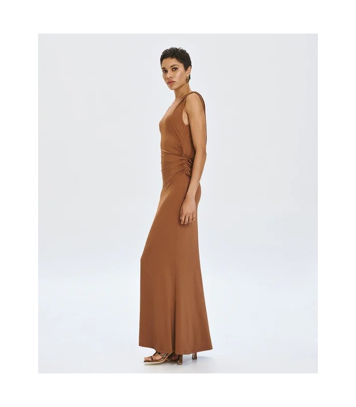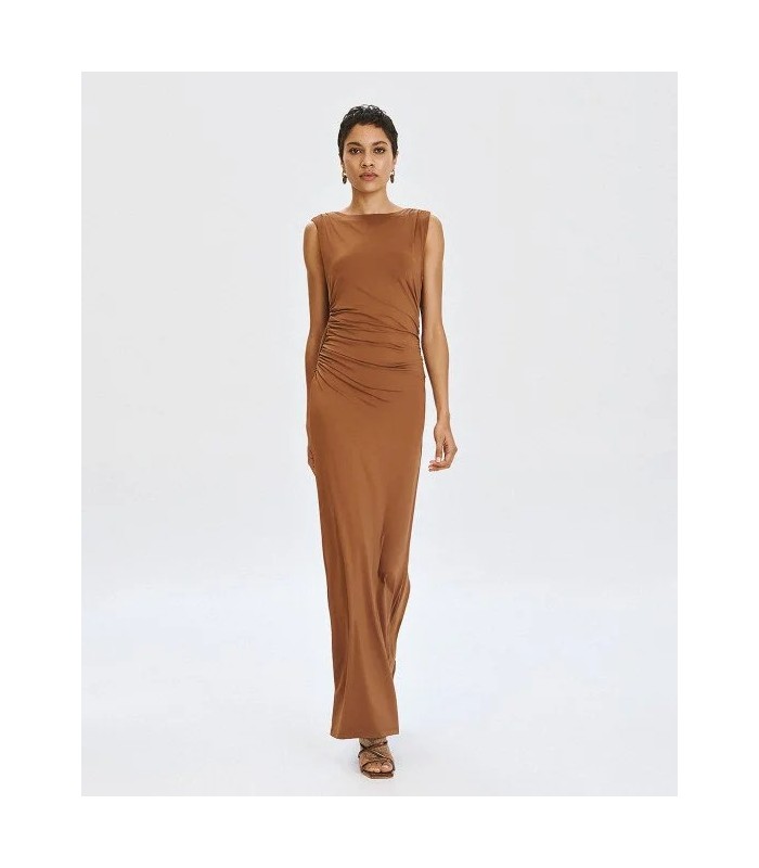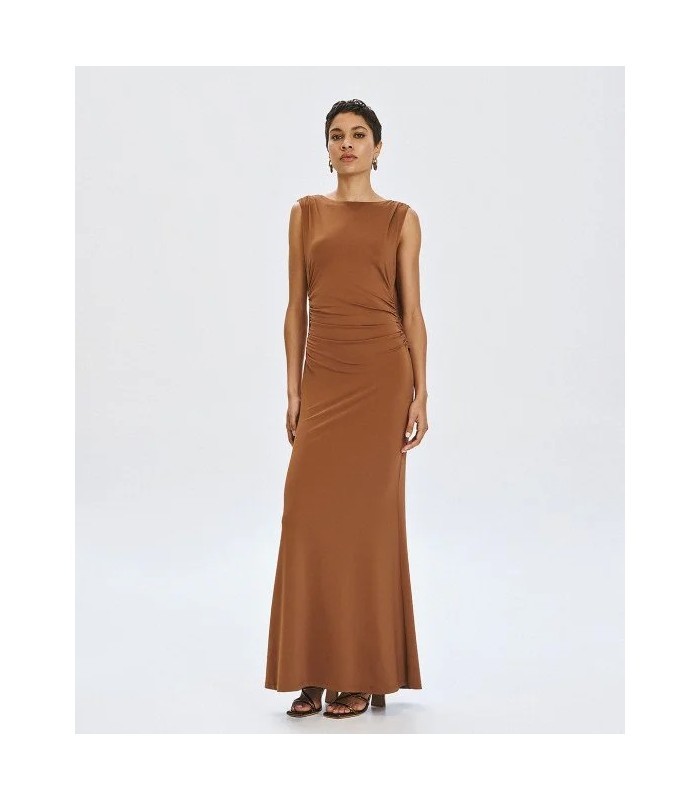 Vestido largo sin mangas con escote redondo y cintura elástica. Presenta una espalda abierta con drapeado y detalles fruncidos.