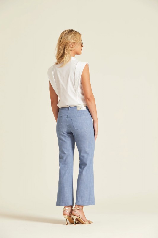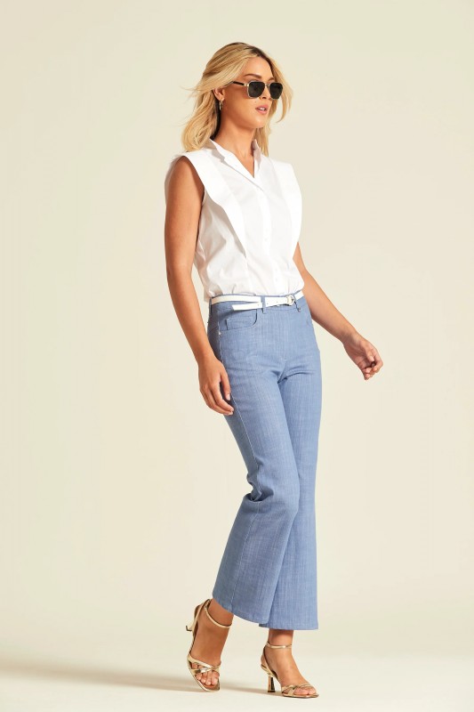 Camisa sin mangas confeccionada en popelín de algodón elástico. Presenta un diseño de cuello camisero con cierre frontal de botones ocultos por tapeta. Destaca por sus amplios volantes laterales que nacen en los hombros, aportando una silueta estructurada y femenina.