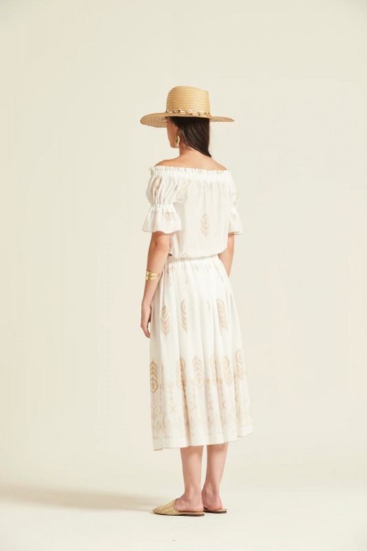 Conjunto de top de favorecedor escote elástico tipo Bardot (hombros descubiertos) con detalle de lazada y borlas, mangas cortas con volantes y falda de largo midi, fruncida con cintura elástica, confeccionados en voile de algodón ligero en tono natural con bordados etnicos