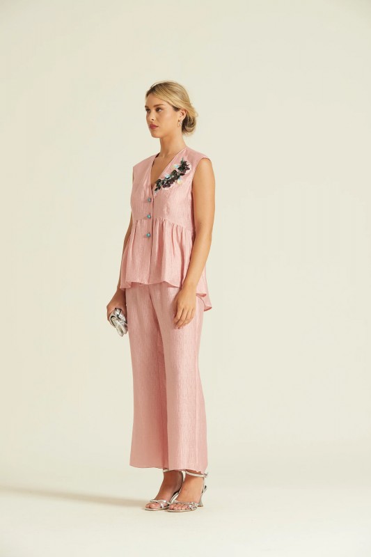 Pantalón de pernera ancha y caída fluida confeccionado en bambula doble de color rosa empolvado. Presenta un diseño limpio sin bolsillos y una cómoda cintura elástica que garantiza un ajuste perfecto sin renunciar a la elegancia.