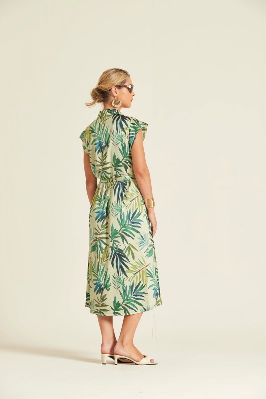 Vestido de corte camisero confeccionado en viscosa elástica con una caída fluida y confortable. El diseño destaca por su juego de rayas verticales en tonos verdes y un bolsillo frontal de plastrón con motivo botánico a contraste. Cuenta con cierre de botonadura frontal, manga 3/4 ajustable mediante trabilla y cinturón del mismo tejido para entallar la silueta. El bajo redondeado con aberturas laterales aporta ligereza y movimiento a la prenda.