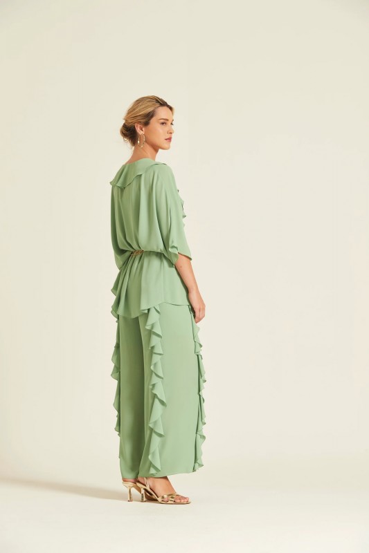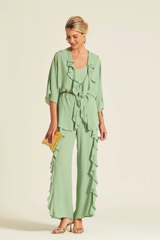 Chaqueta fluida confeccionada en gasa ligera de color verde menta. Presenta un diseño abierto con grandes volantes en el cuello que recorren todo el frontal y mangas de estilo japonés