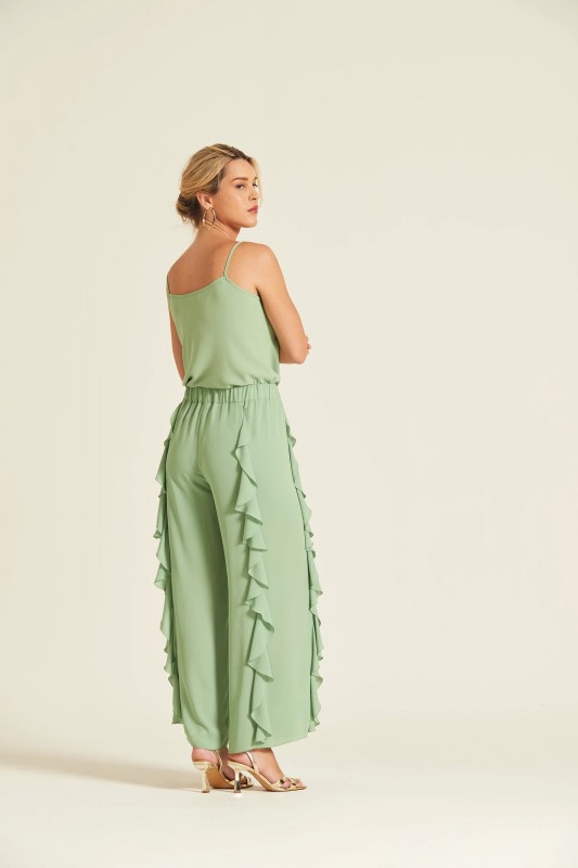 Pantalón de corte fluido confeccionado en gasa ligera de color verde menta. Destaca por sus llamativos volantes en cascada a lo largo de los laterales, que aportan un volumen romántico y mucho movimiento al caminar.