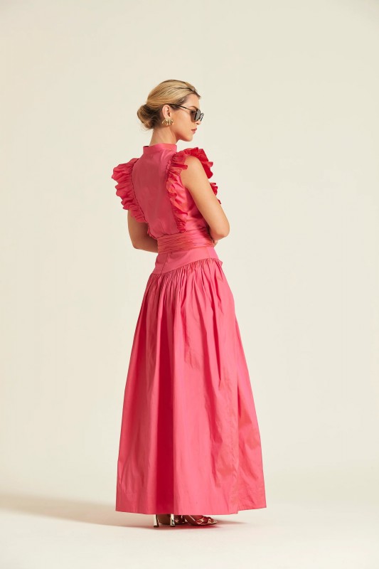 Falda larga de silueta voluminosa confeccionada en tafetán color fucsia. Presenta un diseño de talle alto con una cinturilla ancha que se ajusta mediante una gran lazada frontal