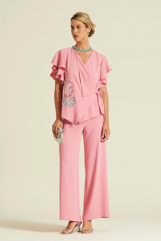Pantalón de corte recto y silueta fluida confeccionado en un suave tono rosa. Cuenta con un diseño clásico que incluye cierre de cremallera frontal