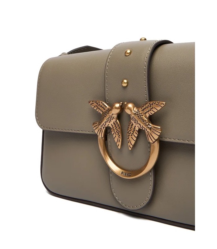 DETALLES: CIERRE CON SOLAPA Y EL ICÓNICO LOGOTIPO DE PINKO, BANDOLERA DE PIEL AJUSTABLE COMBINADA CON CADENA.