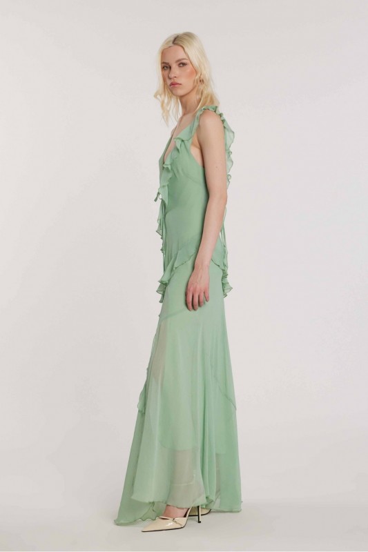 El vestido largo sin mangas Carah, con doble escote en V, volantes y abertura, es elegante y romántico. Los volantes y la abertura crean movimiento, mientras que la abertura añade sensualidad, perfecto para eventos nocturnos de moda.