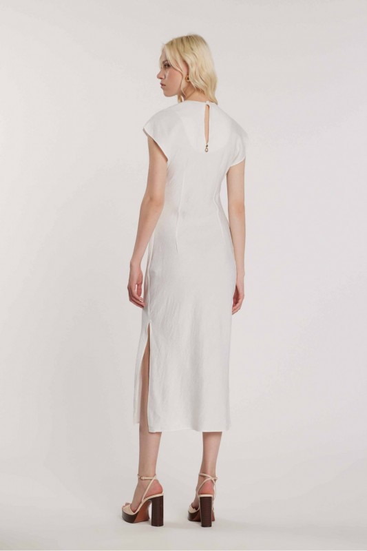 Vestido midi Rubini con mangas tres cuartos, capa, pliegue lateral y espalda en forma de lágrima: una prenda romántica y refinada. El pliegue realza la figura, mientras que la espalda en forma de lágrima aporta una sutil sensualidad y movimiento, ideal para veladas elegantes.