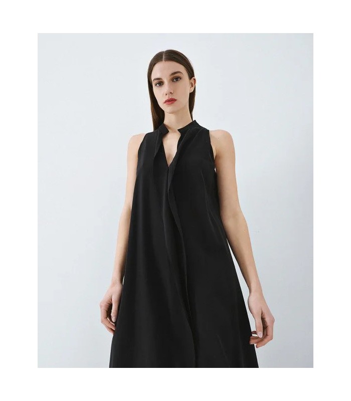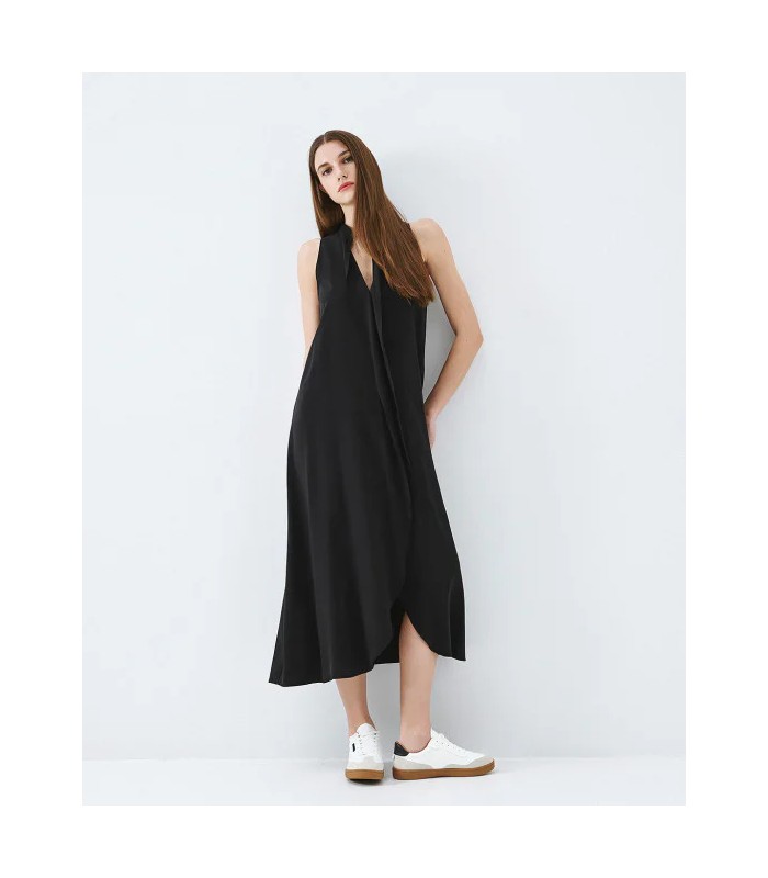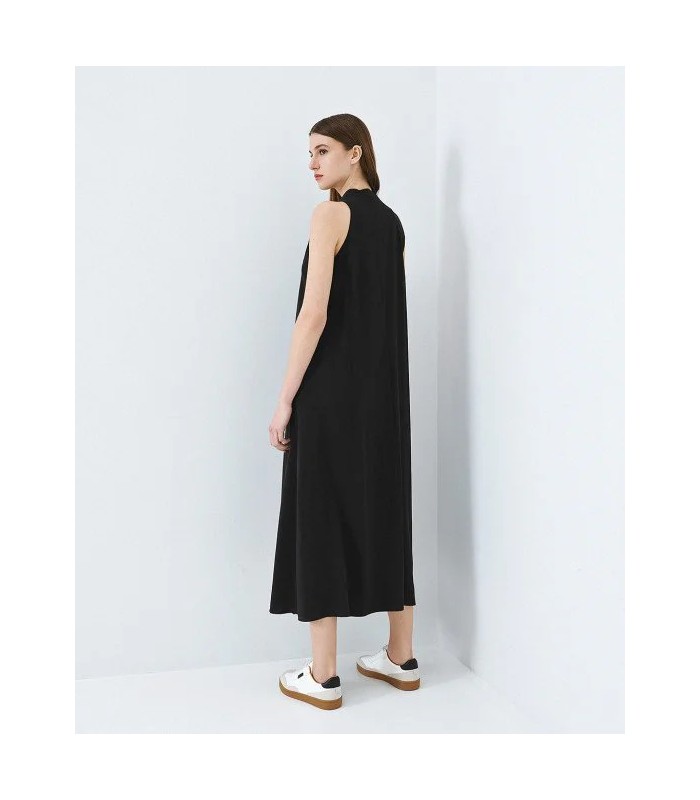 Vestido midi sin mangas con escote en V, detalles de volantes y abertura frontal.