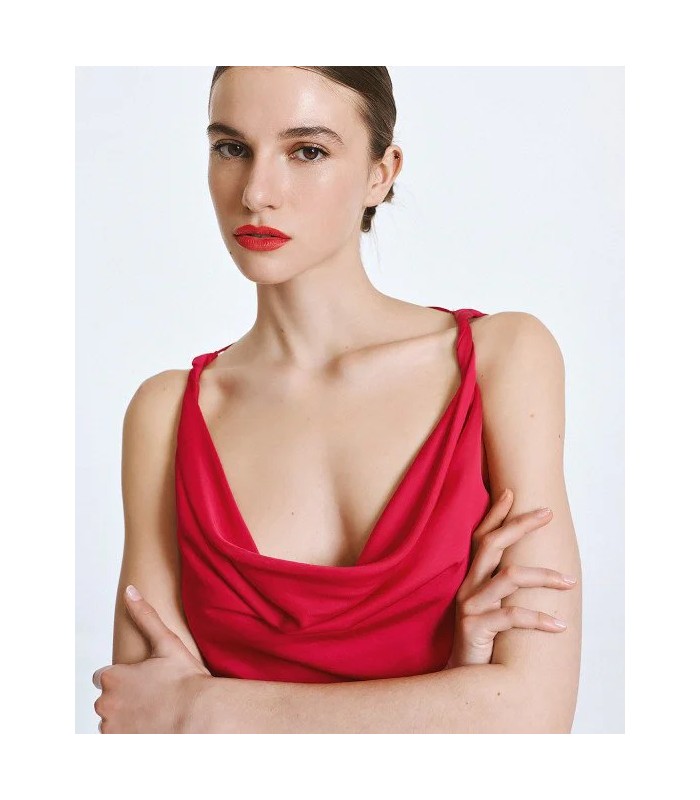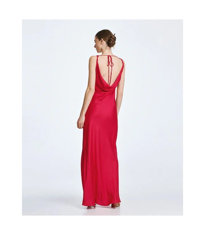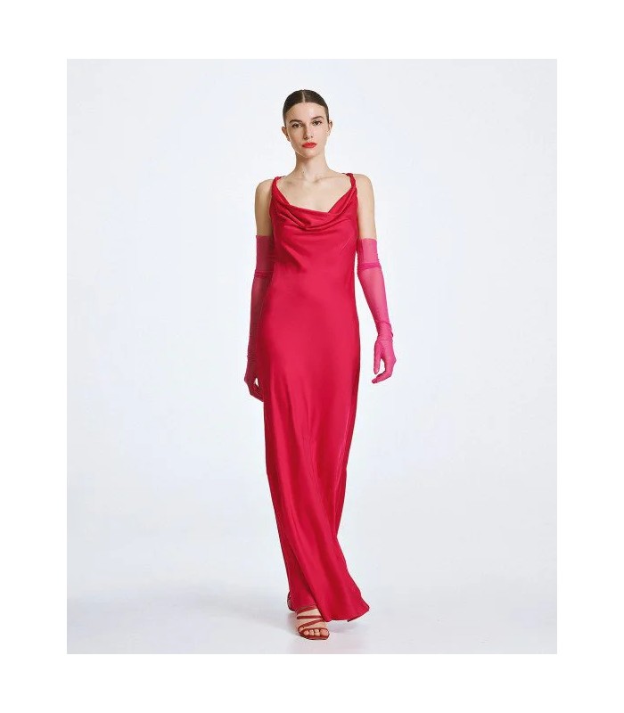 Vestido largo de satén con tirantes y diseño drapeado en la parte delantera y trasera.